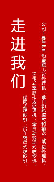 動軌道式和輸送式毛邊處理機(jī)、環(huán)帶式塑膠毛邊處理機(jī)、全自動輸送式噴砂機(jī)、滾筒式噴砂機(jī)、臺車轉(zhuǎn)盤式噴砂機(jī)、自動回收加壓式噴砂機(jī)、開放式噴砂機(jī)、旋風(fēng)式噴砂機(jī)、虹吸式標(biāo)準(zhǔn)密閉式噴砂機(jī)、環(huán)帶式噴砂機(jī)、履帶式研掃機(jī)及自動回收噴砂機(jī)房等各種產(chǎn)品。